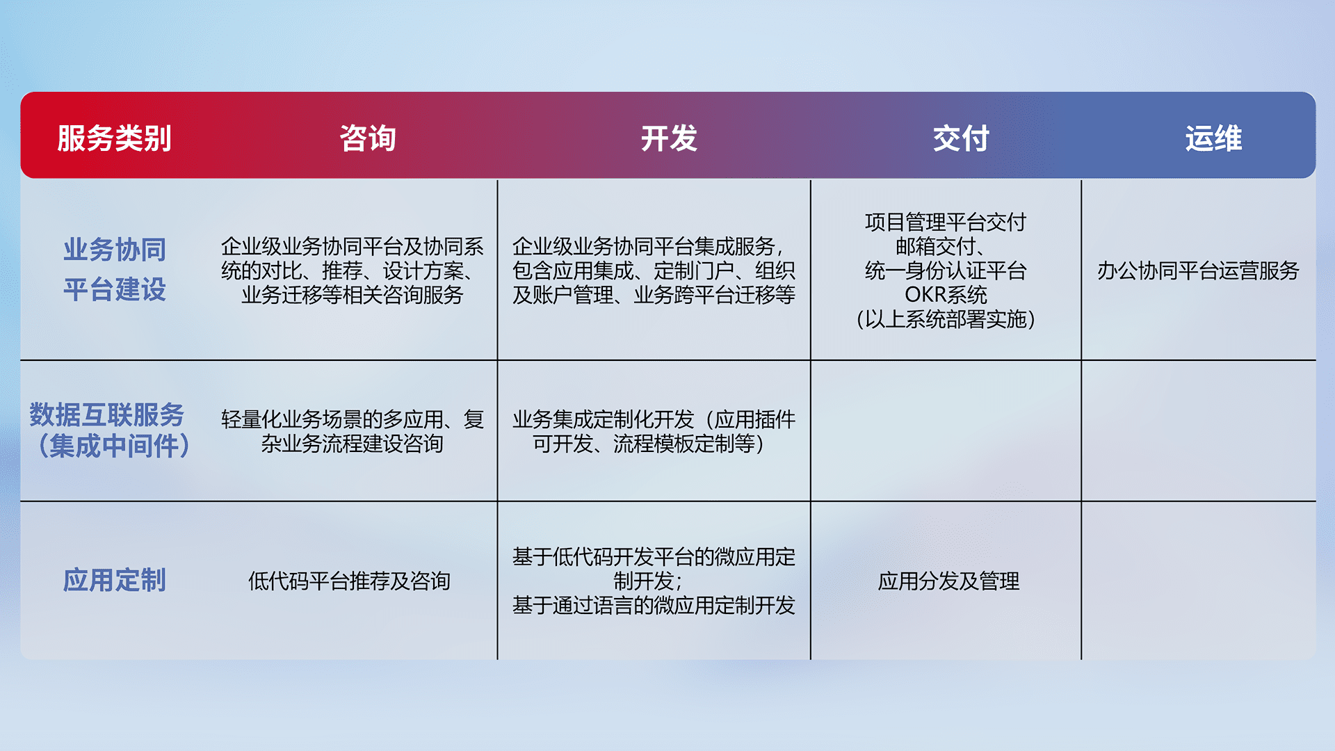 针对钉钉、、、、企微、、、IDaas等平台级产品提供产品的规划、、、、方案、、、、交付、、定制化开发等服务,,,,实现如统一协同办公、、智能客户服务、、、、混合会议管理、、、智能数据查询、、、、等业务场景,,实现数字化转型。。。